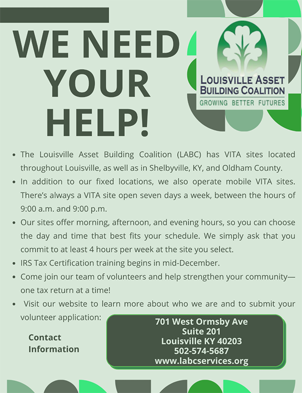 The coalition is committed to bettering its members and the community by leveraging the success of its free tax preparation and Earned Income Tax Credit (EITC) Campaign. LABC also provides a continuum of financial education resources and asset development initiatives in conjunction with Louisville Metro's Office of Financial Empowerment.